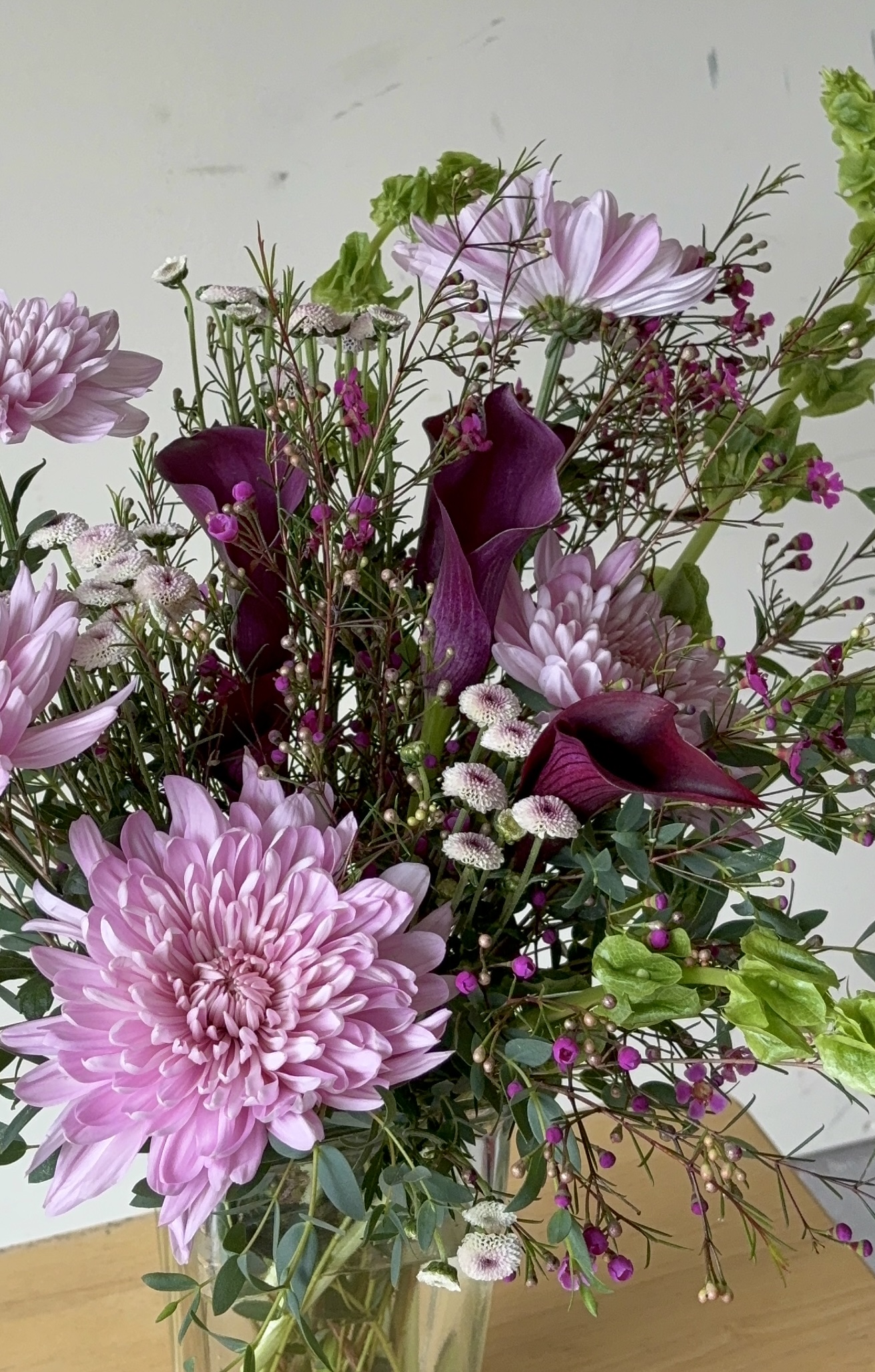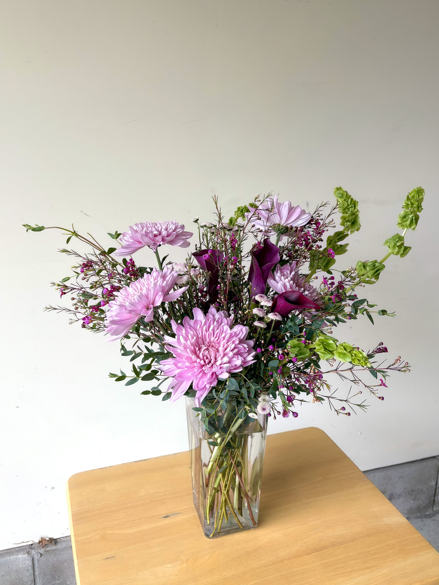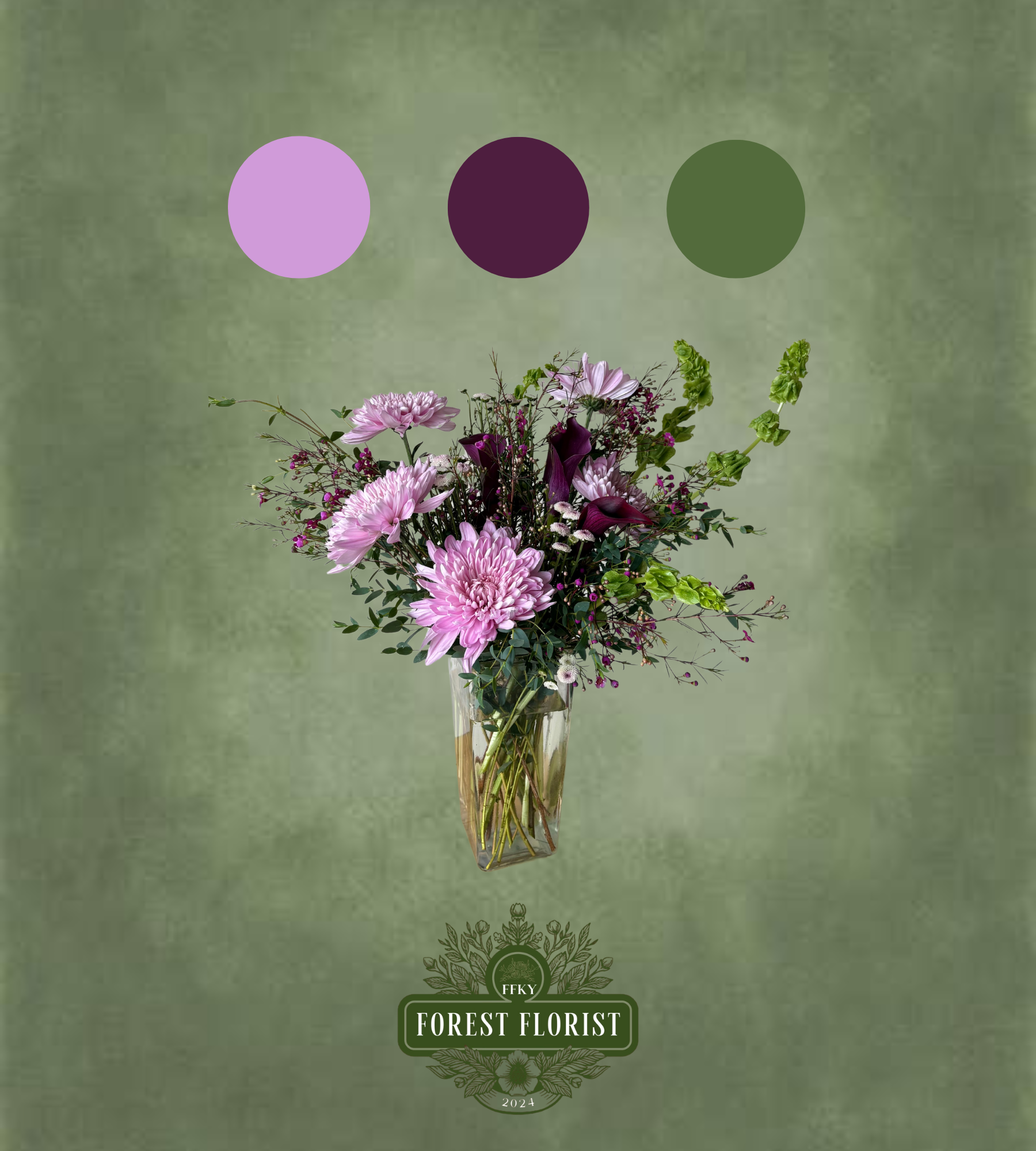 Vase arrangement to include purple, burgundy, and green seasonal blooms. Flowers and vase will vary, but color palette will be consistent. Available in Deluxe and Premium sizes.