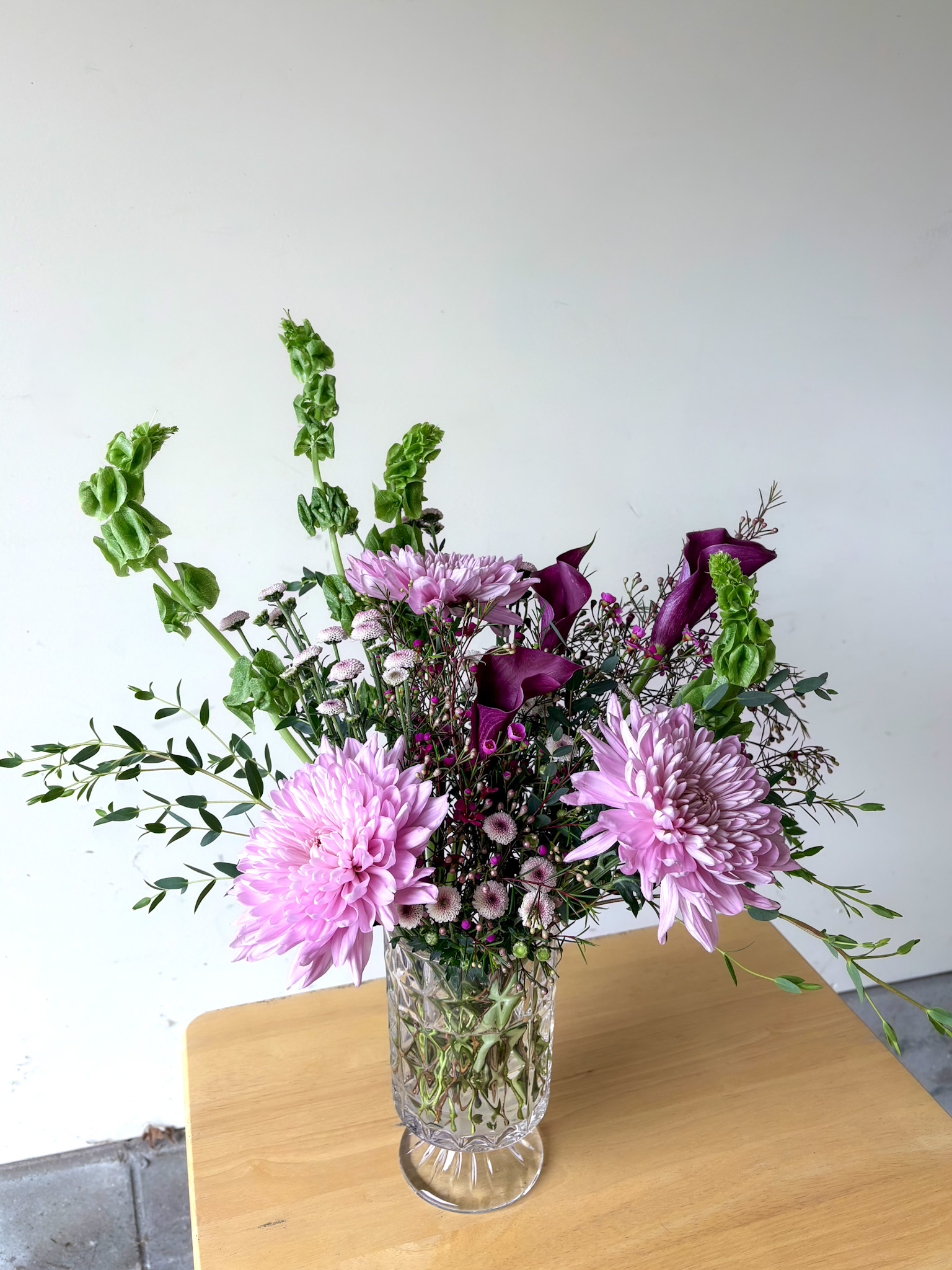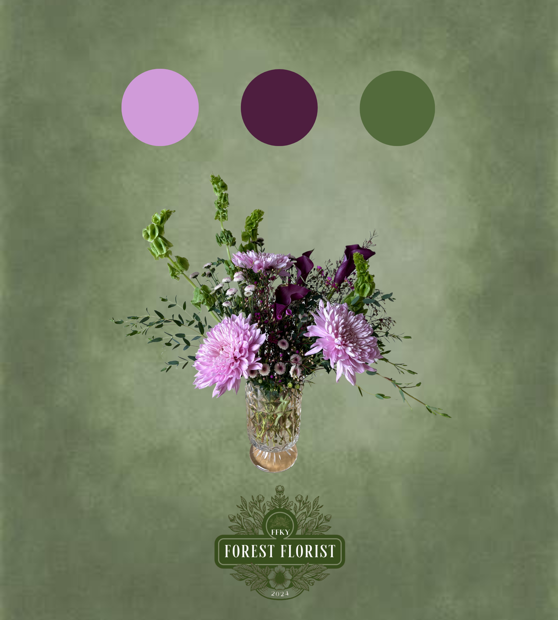 Vase arrangement to include purple, burgundy, and green seasonal blooms. Flowers and vase will vary, but color palette will be consistent. Available in Deluxe and Premium sizes.