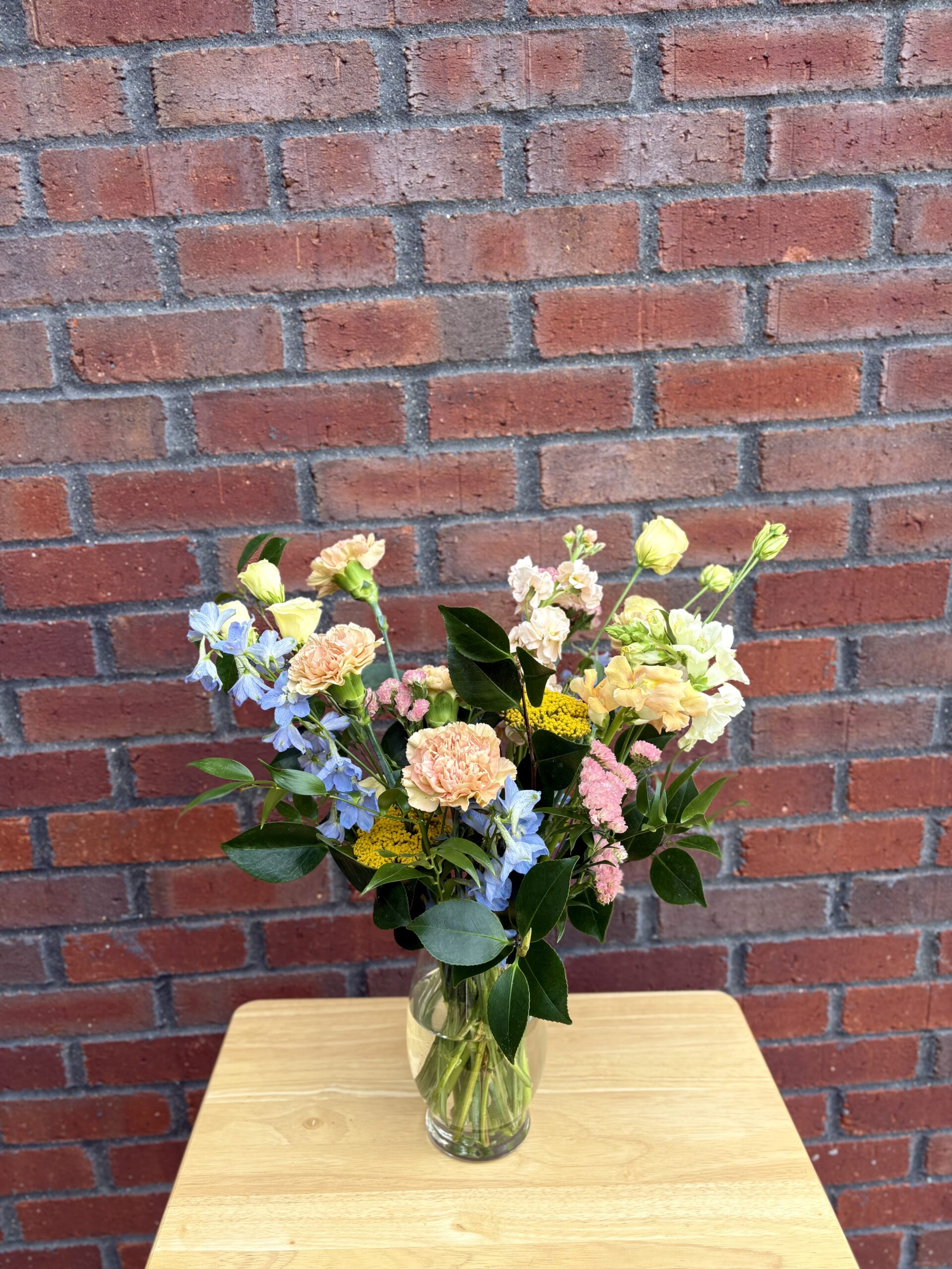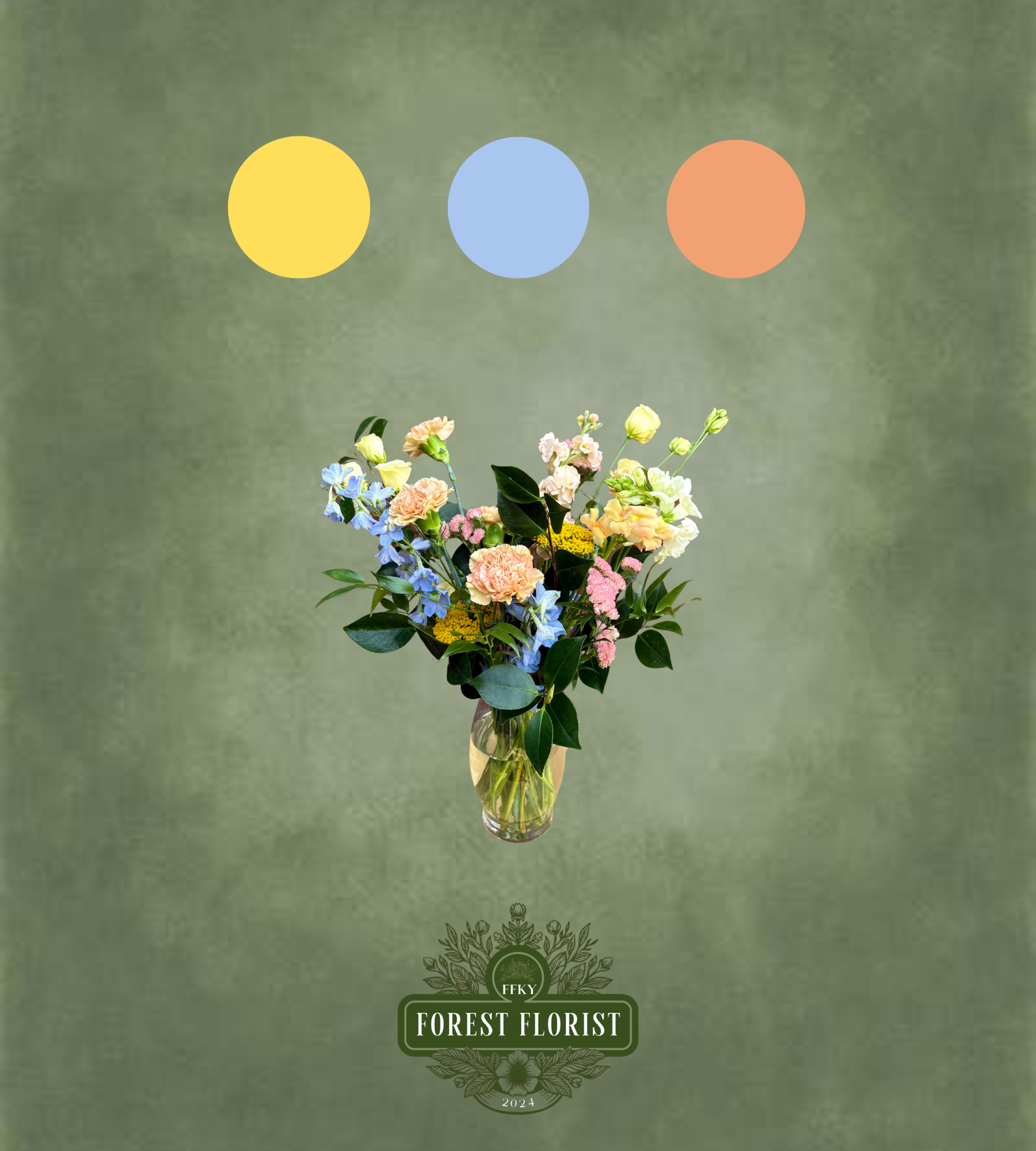 Vase arrangement to include peach, blue, and yellow seasonal blooms. Flowers and vase will vary, but color palette will be consistent. Available in Deluxe and Premium vases, as well as Deluxe and Premium wrapped bouquets.
