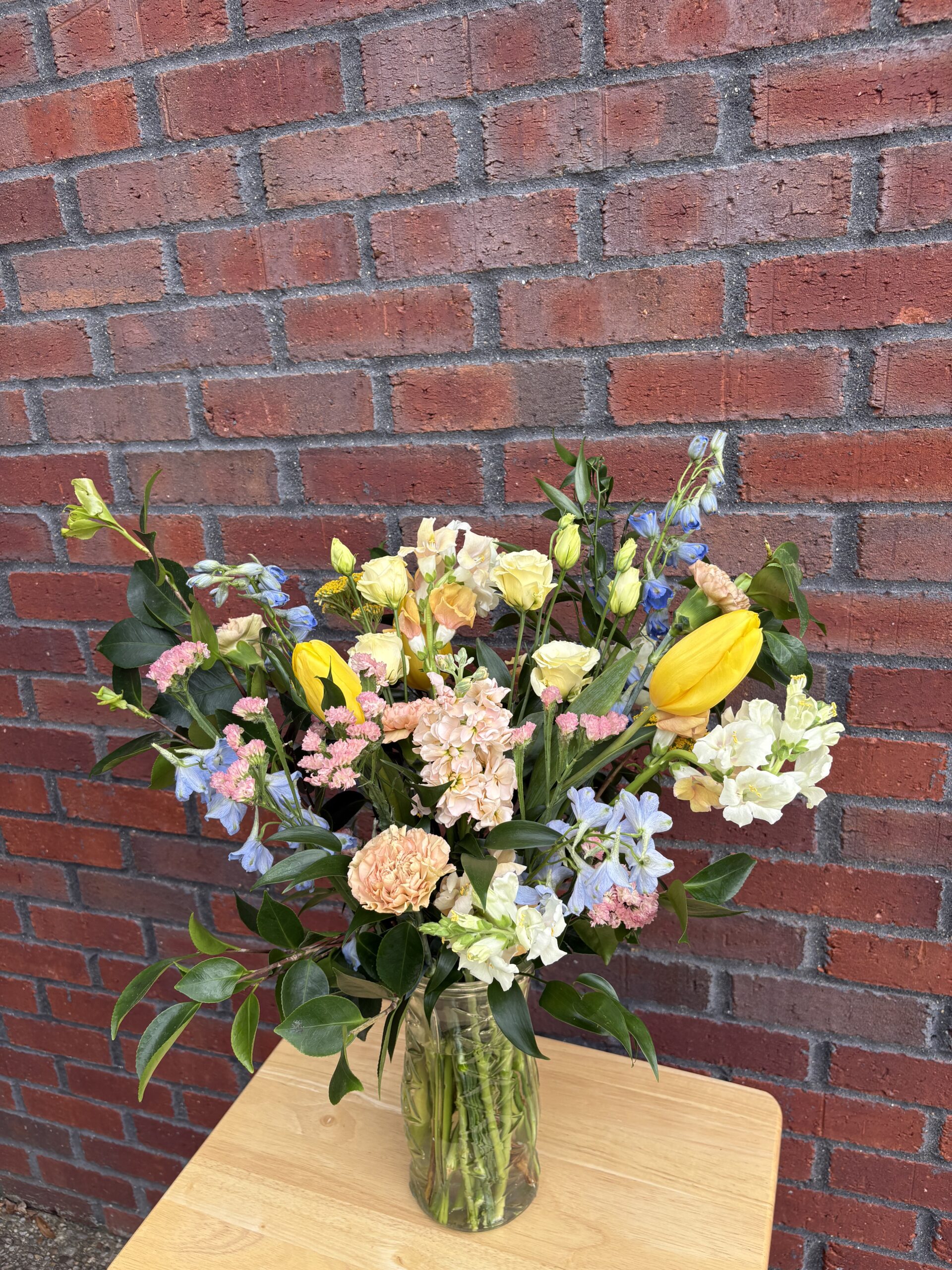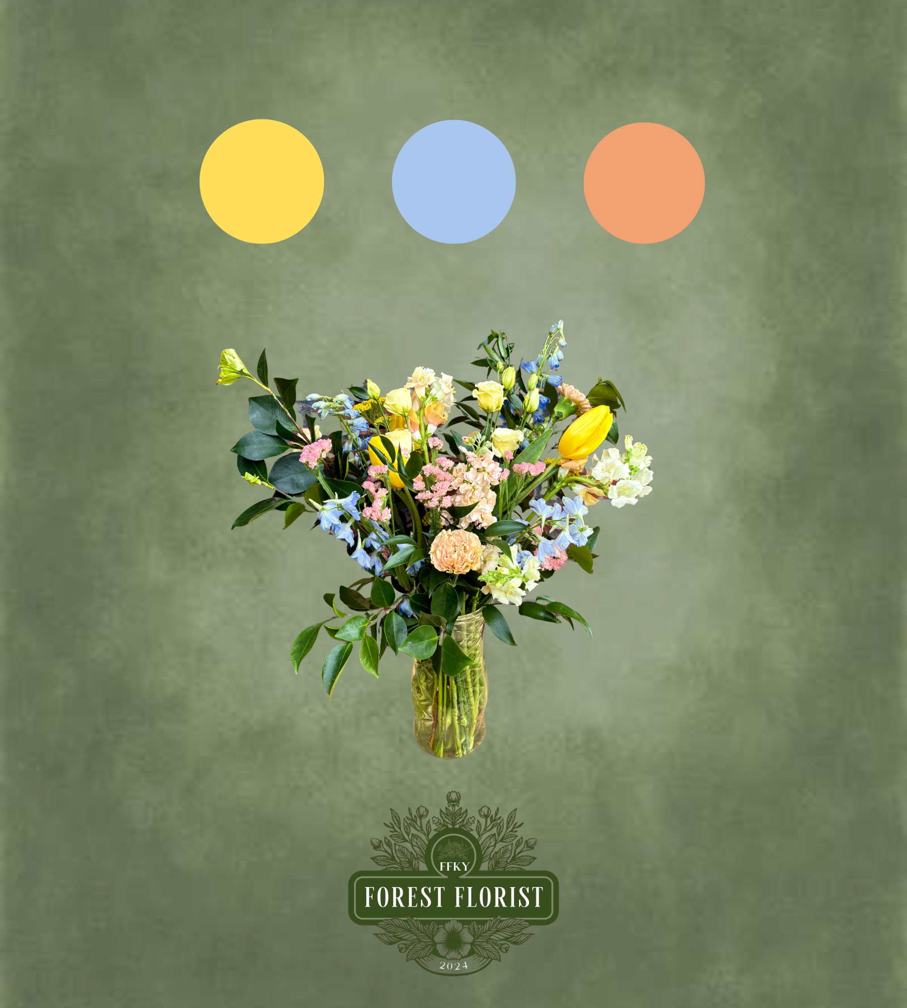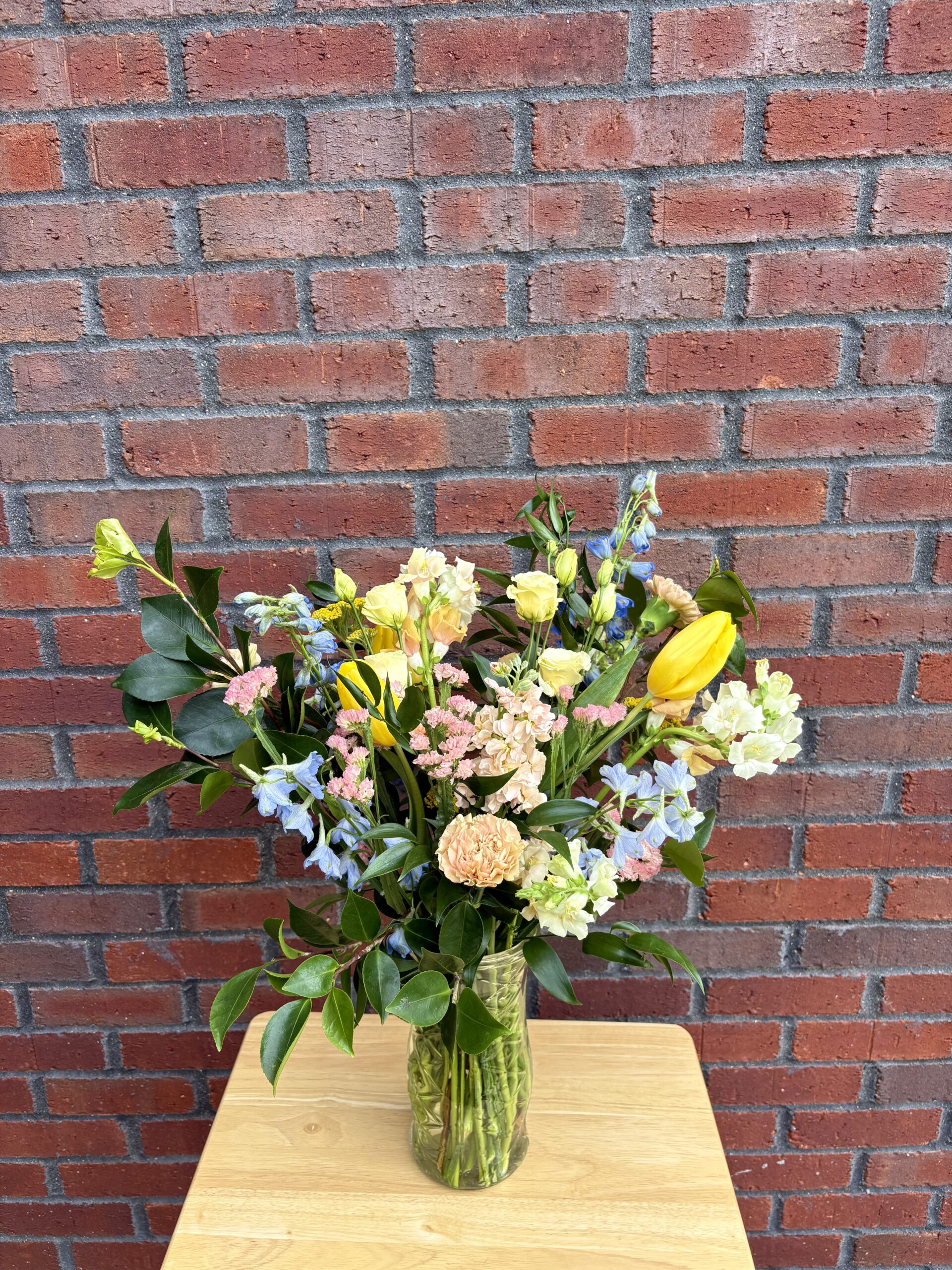 Vase arrangement to include peach, blue, and yellow seasonal blooms. Flowers and vase will vary, but color palette will be consistent. Available in Deluxe and Premium sizes.
