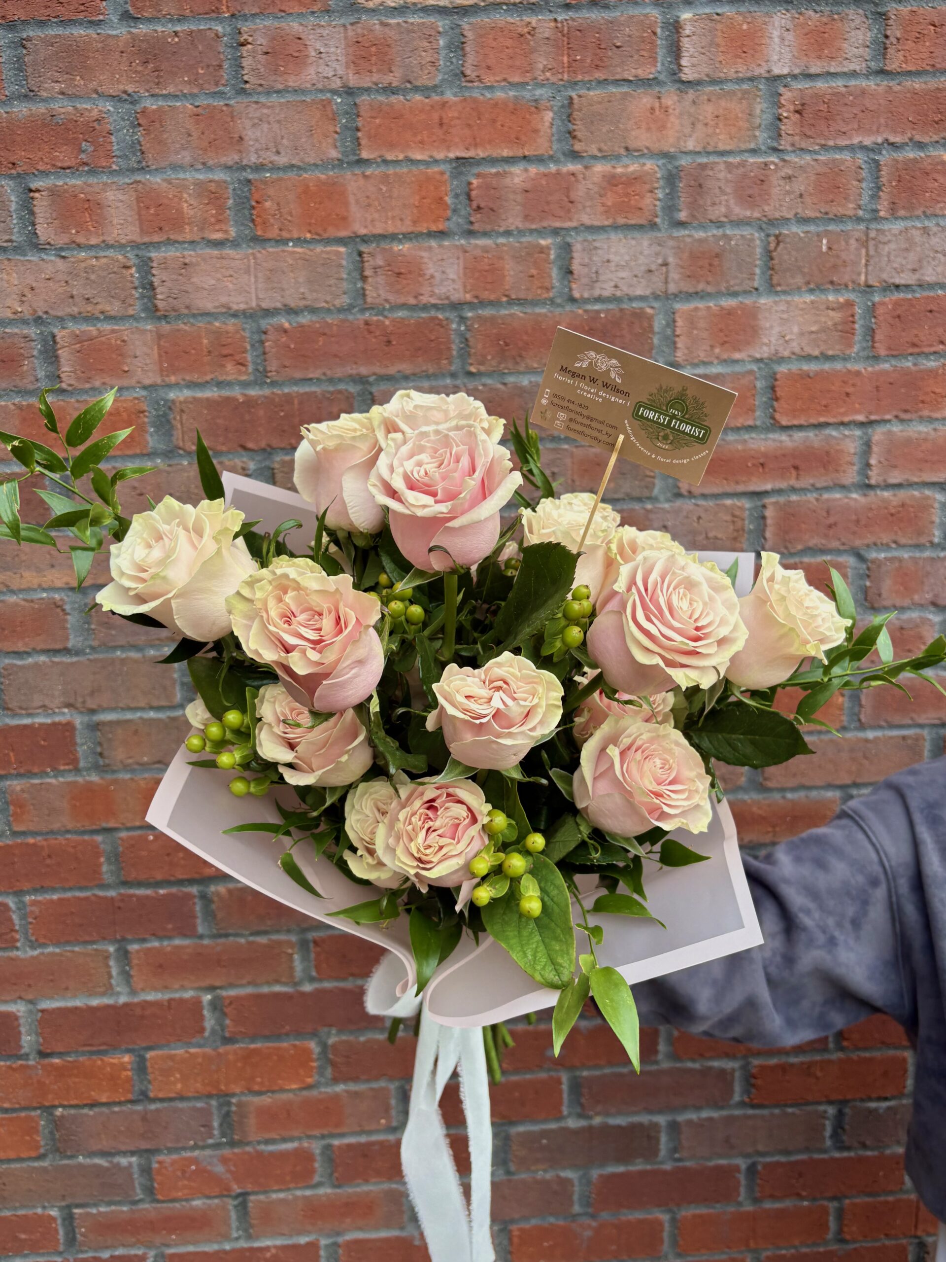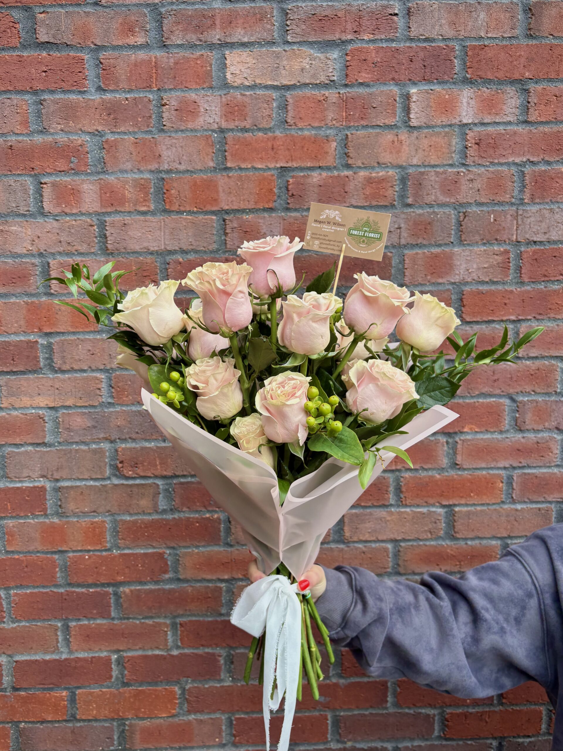 Bouquet to include two dozen pink roses, berries, and greenery.