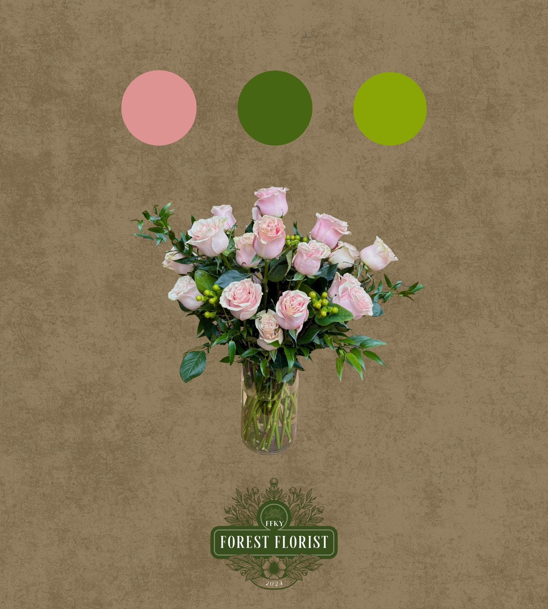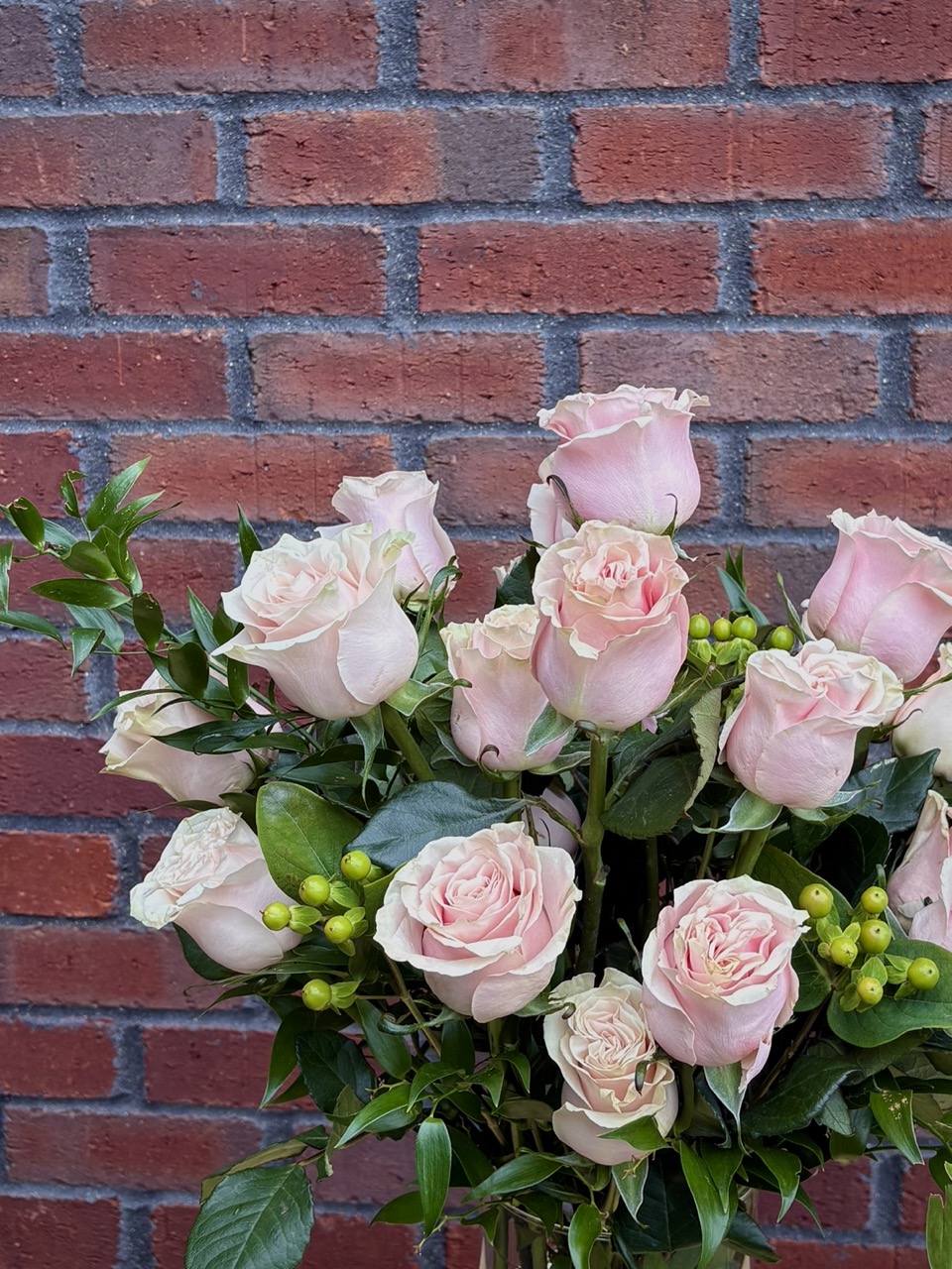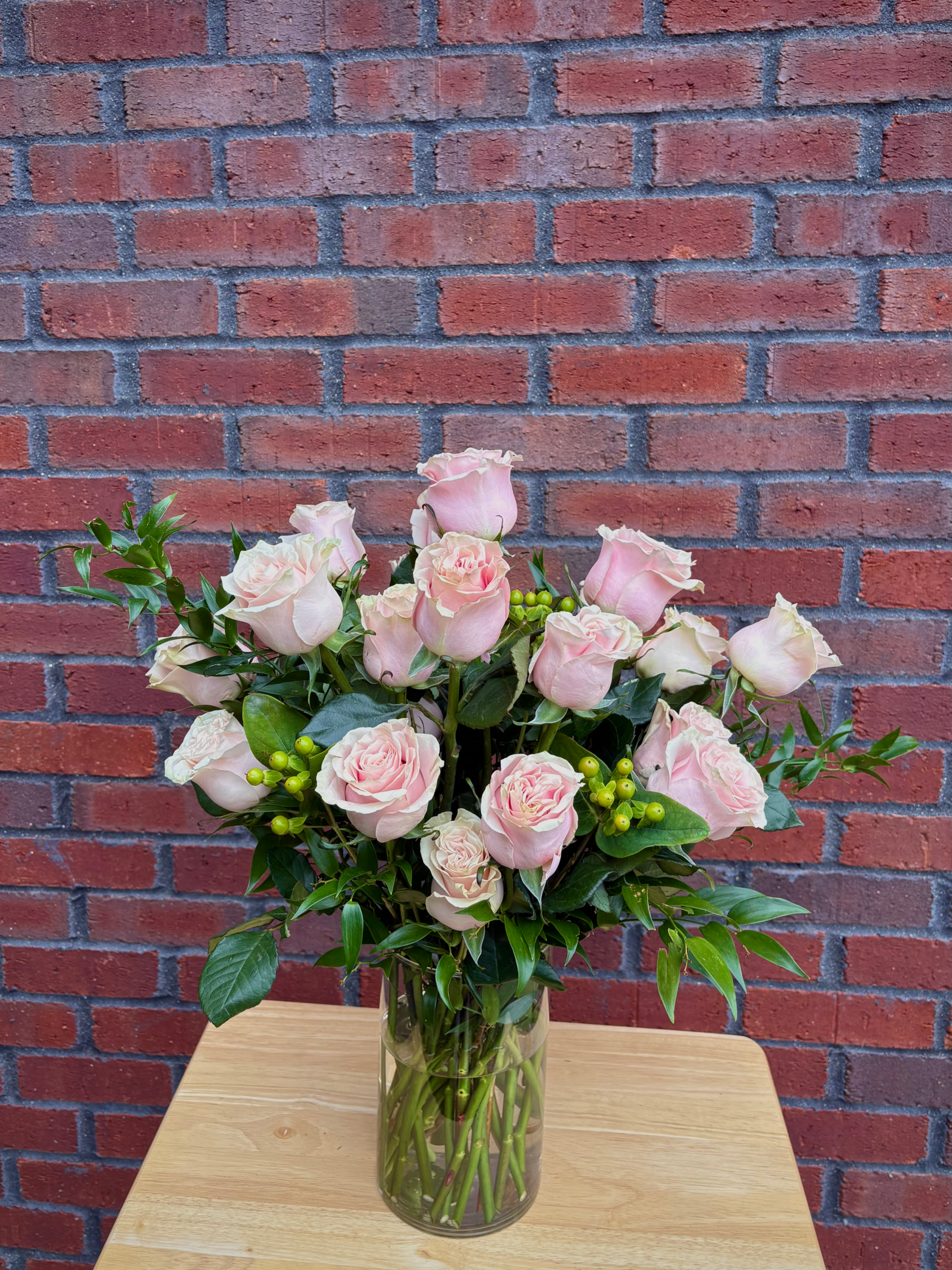 Vase arrangement to include two dozen pink roses, berries, and greenery.